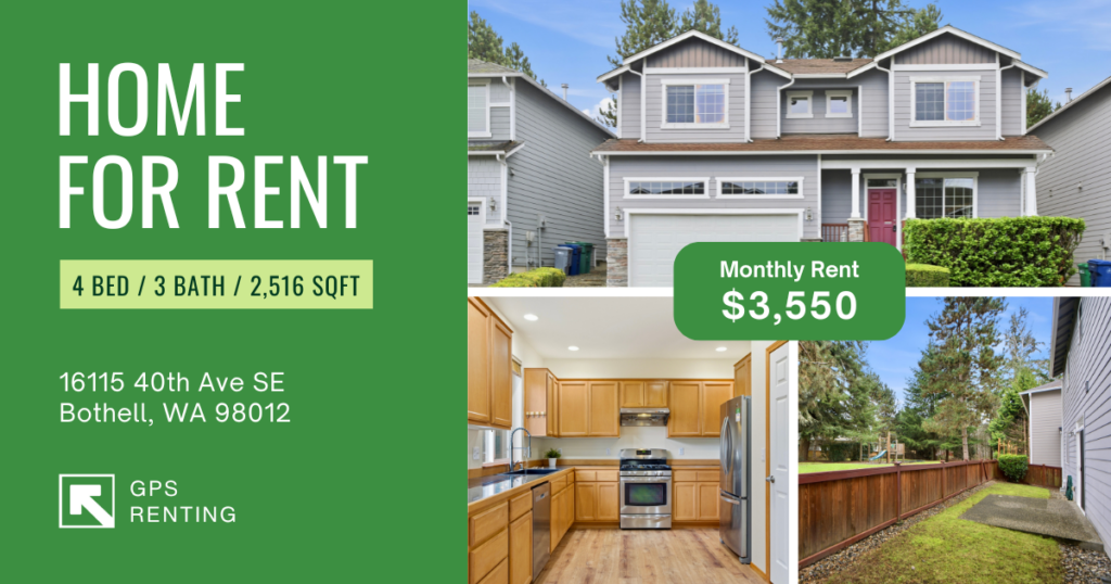 GPS Renting conducted a comparative market analysis of 4 bedroom rentals in Bothell and nearby areas. The home’s location, size, and condition supported a competitive pricing strategy.